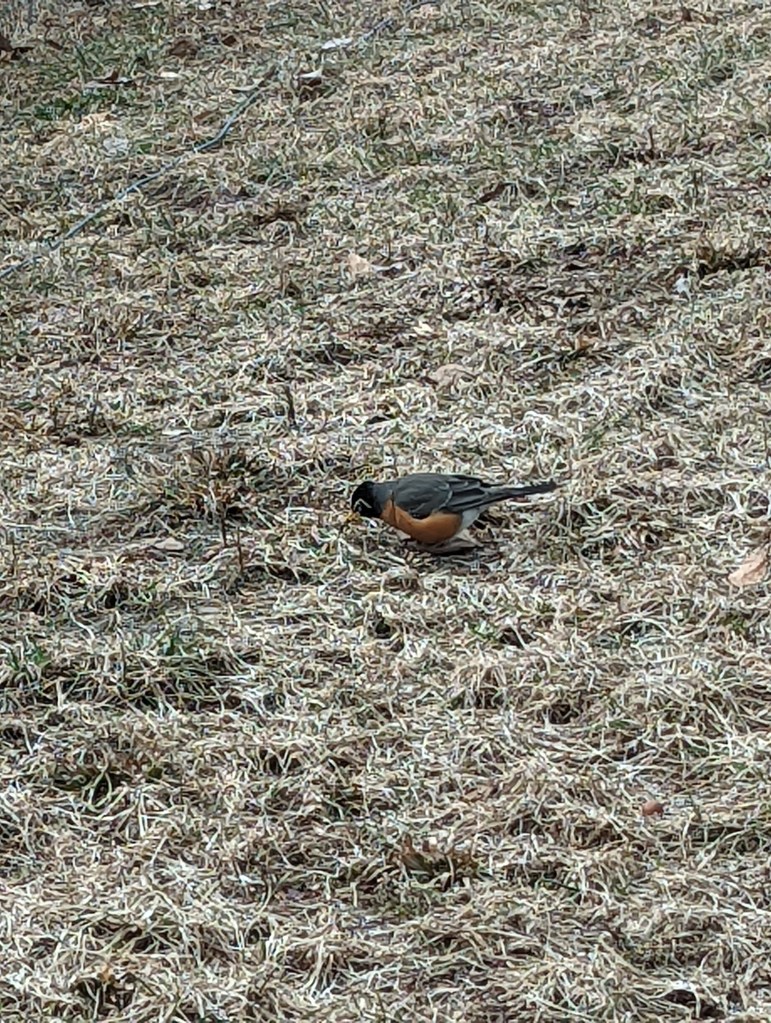 The robins have started to visit us in the Adirondacks! A dozen or so combing the field. Not sure what they are looking for (I have not yet seen a worm on the property), but they were finding something.