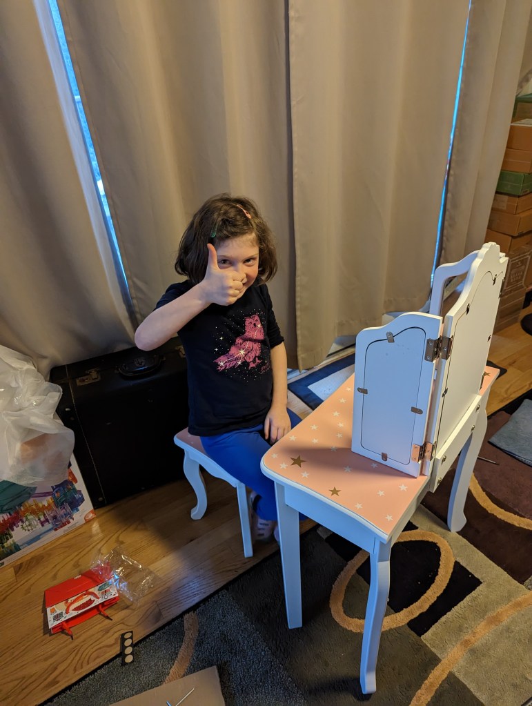 My wife and I bought for our Georgia granddaughter a vanity for Chistmas. It had not been put together yet when I visited in February. So I decided to put the vanity together while I was in Georgia. I started the process when my granddaughter come up to me, and after asking what I was doing, asked if she could help. I responded yes! of course. She did most of the build after that. It was an awesome bonding experience!