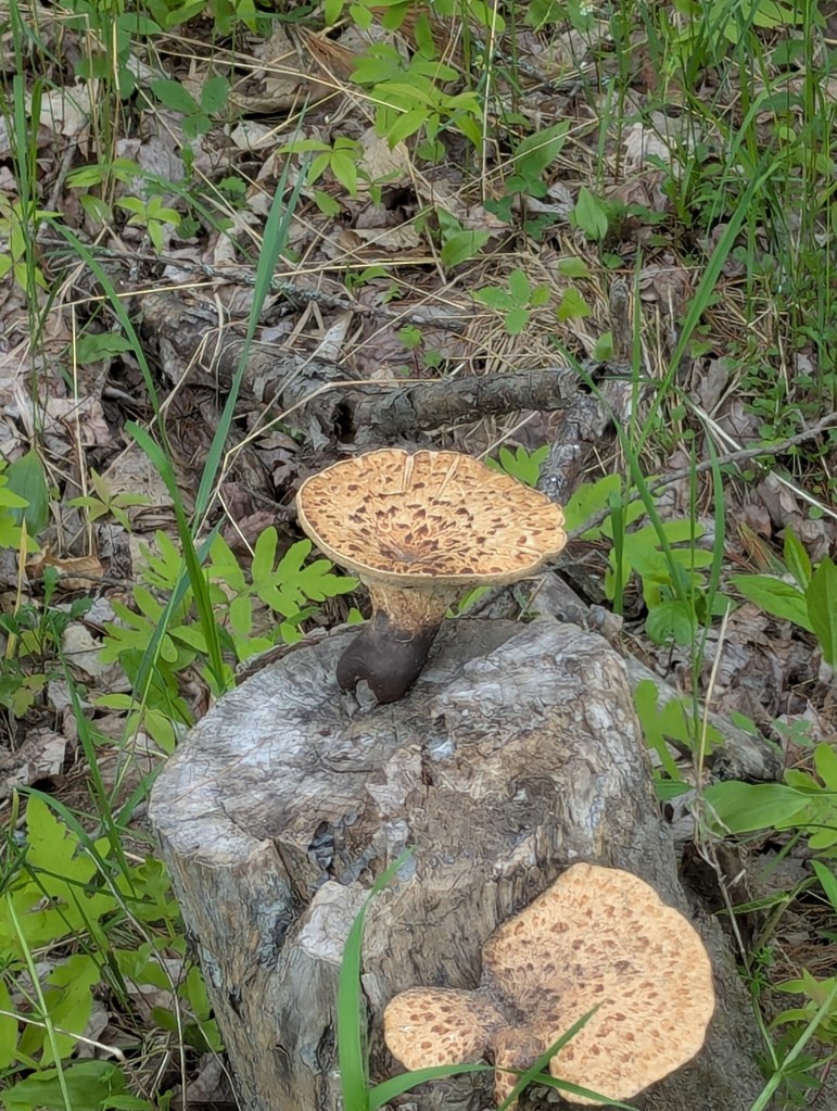 Dryad’s Saddle gets its name from the old belief that wood nymphs, or “dryads,” might use the broad, flat caps as resting places. The ones I observed were striking: pale yellow-tan with prominent brown scales, like a leopard’s spots on a saddle-shaped fungus. Each cap was about 6 to 10 inches across—though they can grow even larger—and stacked in overlapping shelves on the side of a fallen log.